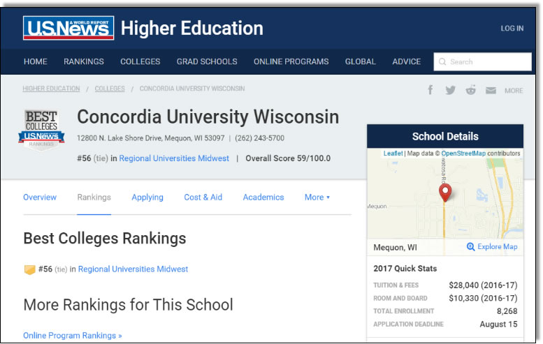 美国新闻与世界报道USnews公布了2017年美国本科院校的排名,本科院校排名分为综合性大型和文理学院,按地理位置又分为地区性大学和地区性文理学院。下面是2017年USnews美国中西部地区大学排名,此次排名内容涉及到了学费、学生数以及录取率等众多因素。其中在中西部联盟-横跨美国12个州的1431所学校中,美国威斯康星协和大学排Top56名,(US News-America' Best College 2015, University-Master's (Midwest 第一级)。校誉远超过多所州立公立大学(选官方公布网站)